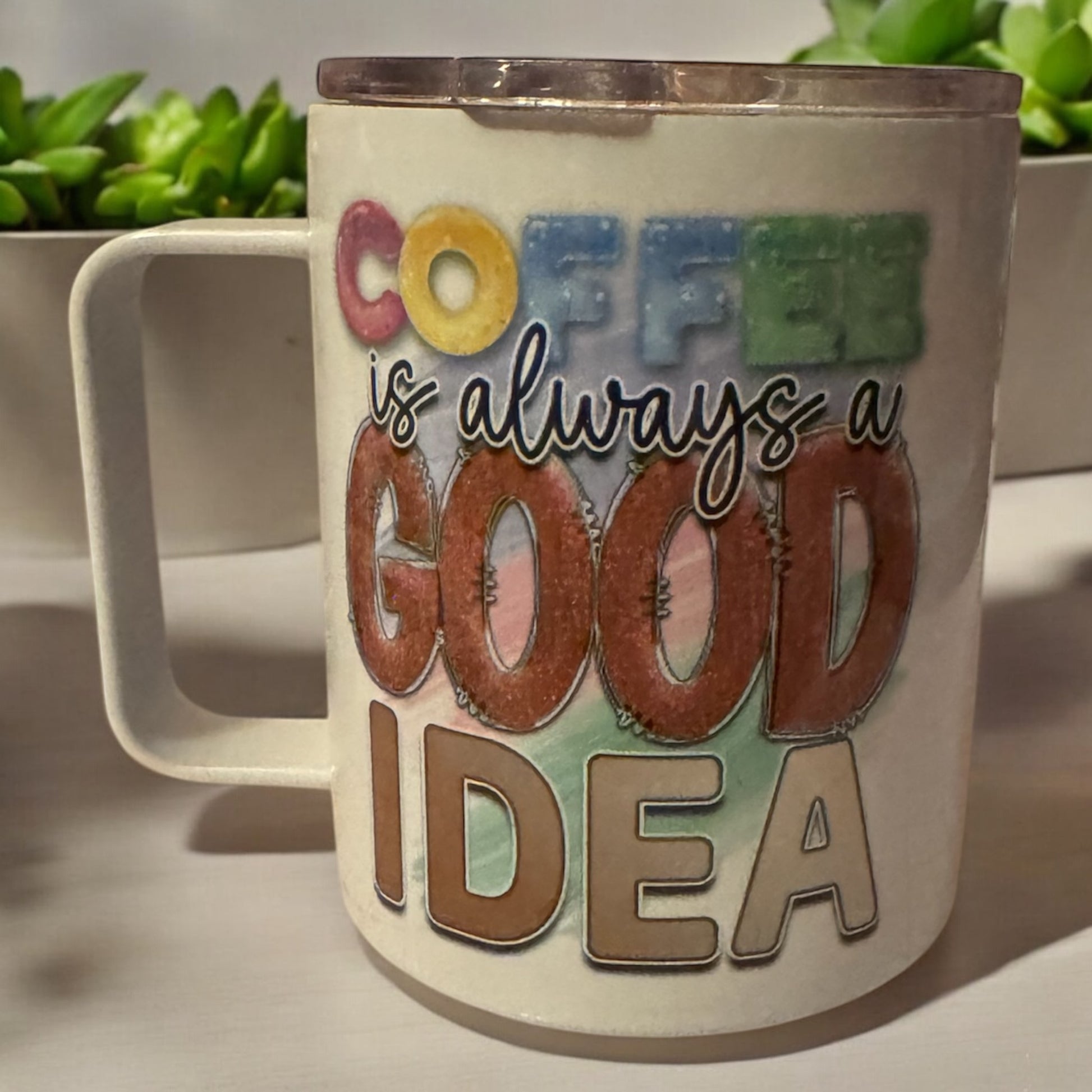 Start your day off right with our 12oz camper mug! Designed with funny and sarcastic coffee sayings, this mug is sure to put a smile on your face. BPA and lead-free, it's perfect for keeping your drink cold or warm for hours.